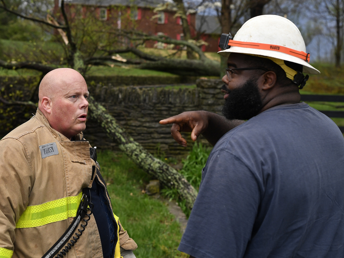 Capt. Patrick Staudenheimer, left, with the Anchorage Middletown Fire Department, speaks with an employee of the Louisville Gas and Electric company informing him of possible gas leaks following severe storms in Prospect, Ky., Tuesday, April 2, 2024.